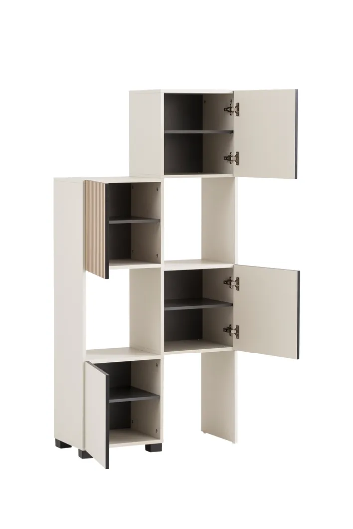 Das Regal verfügt über vier Drehtüren und vier Einlegeböden, die vielseitige Ablagemöglichkeiten bieten. Zwei offene Fächer ermöglichen eine ansprechende Präsentation von Dekorationsgegenständen. Ein besonderes Highlight ist die Holznachbildung mit einem gestreiften Muster, das dem Möbelstück eine besondere Note verleiht. Die klaren Linien und die moderne Gestaltung machen das Regal zu einem idealen Möbelstück für zeitgemäße Wohnräume.