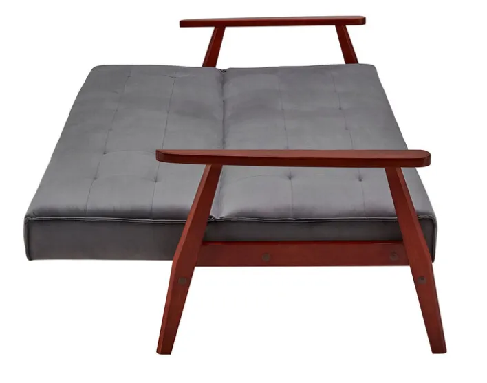 Das Schlafsofa mit festen Armteilen benötigt eine Stellfläche von 190 x 85 cm. Es besteht aus einem robusten Vierfußgestell aus massivem Eukalyptusholz in der Farbe Kirschbaum und einem angenehm fest gepolsterten Sitz- und Rückenbereich. Stilvolle Zierknöpfe und eine elegante Kissensteppung perfektionieren das Skandi-Design. Das Highlight des Sofas sind jedoch seine Funktionen. Bei der Relaxfunktion lässt sich die Rückenlehne um 60° neigen, während es die Schlaffunktion im Handumdrehen in ein Gästebett verwandelt.