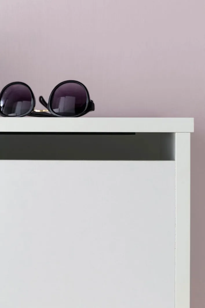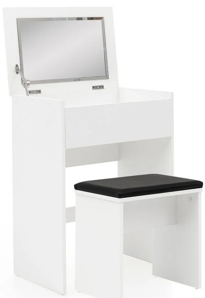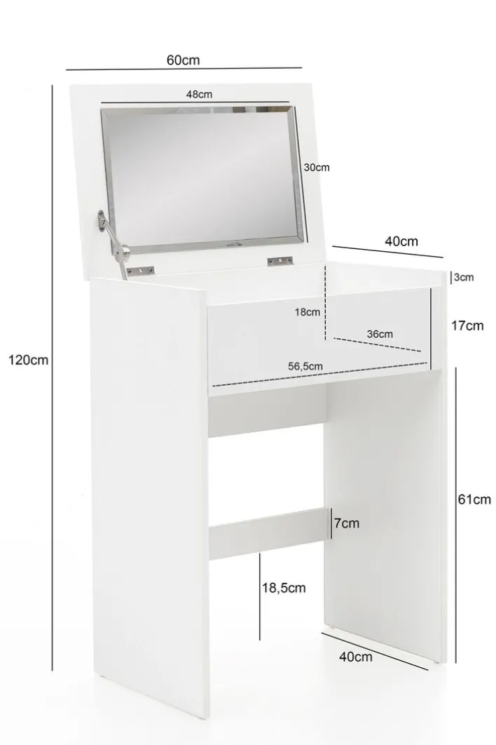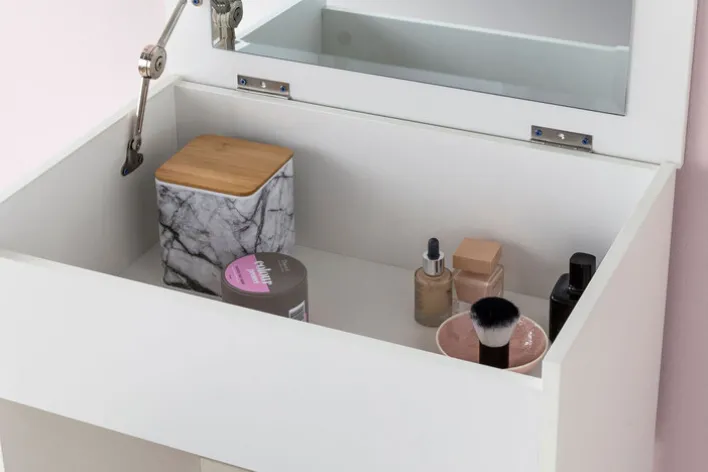 Der weiße Schminktisch hat die Abmessungen 60 x 81 cm. Der Hocker und der Spiegel sind bereits im Lieferumfang enthalten. Wird der integrierte Spiegel nicht gebraucht, lässt er sich einfach einklappen.