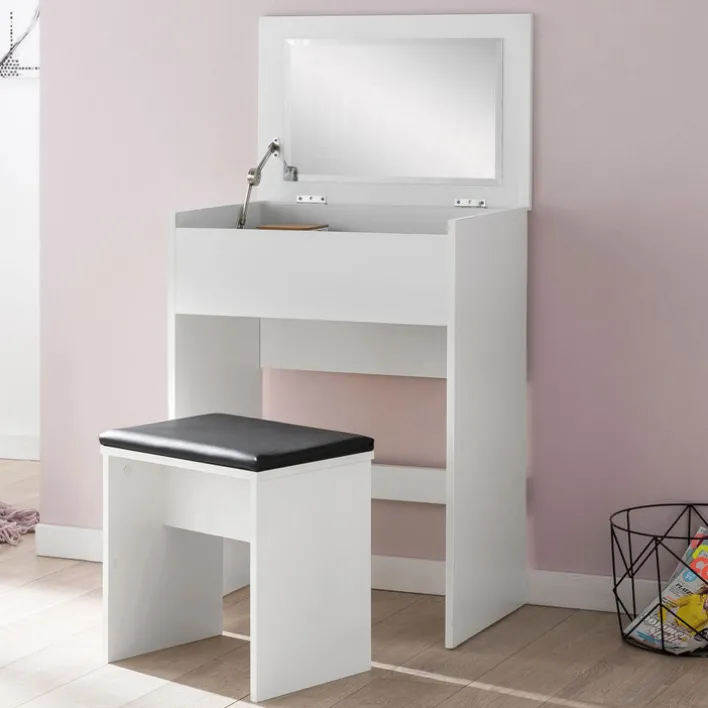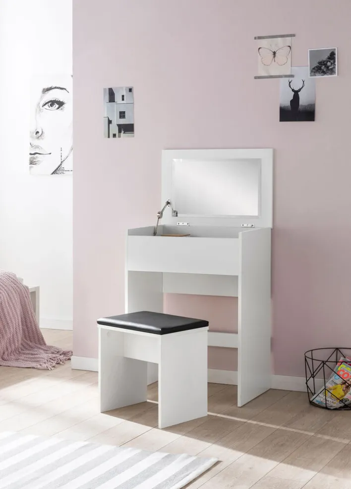 Der Schminktisch findet aufgrund seiner geringen Größe in jeder Wohnung Platz. Am besten stellt man ihn im Schlafzimmer auf. Auch für Teenager hat er Vorteile, weshalb er ebenso eine gute Wahl für das Jugendzimmer darstellen könnte. Der mitgelieferte Hocker, der optisch perfekt zum Tisch passt, ist leicht gepolstert. Der Spiegel befindet sich auf der Innenseite der Klappe, unter der sich ein Fach für Make-up versteckt.