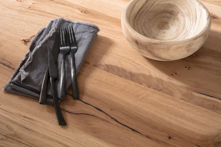 Auf den ersten Blick begeistert die formschöne Optik des Esstischs mit dem massiven Säulengestell. Während die Bodenplatte in einem matt schwarzen Farbton gestaltet ist, wirken Gestell und dicke Tischplatte mit der geölten Oberfläche in der Farbnuance „Eiche Rustico hell“ als harmonischen Einheit. Der für den Innenbereich konzipierte Tisch bietet bis zu sechs Personen während einer Mahlzeit oder einer Konferenz Platz.