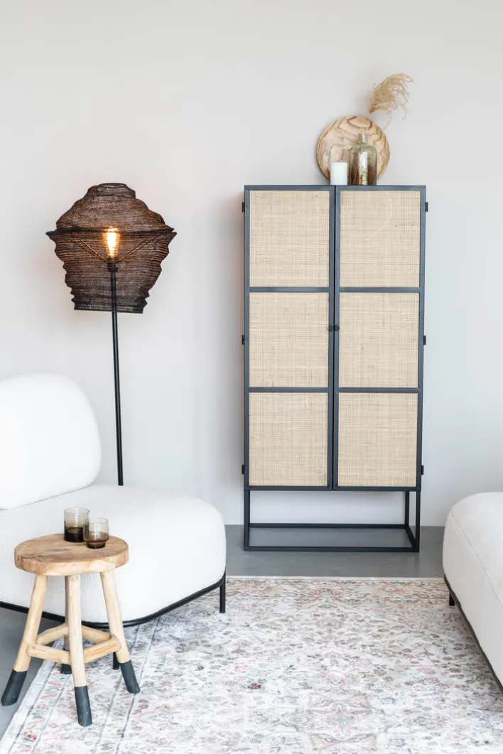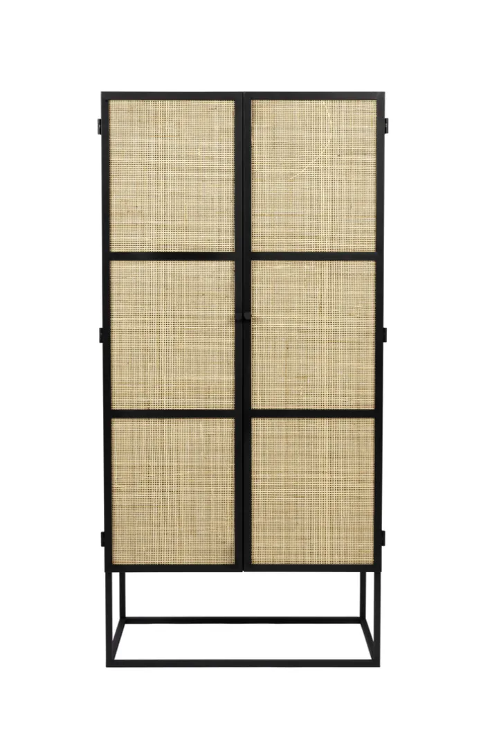 Der Schrank JOANNA vereint ein schlichtes, schwarz pulverbeschichtetes Metallgestell mit schwarz lackierter Holznachbildung und natürlichem Rattangeflecht. Mit einer Größe von 79 x 145 x 38 cm bietet er viel Stauraum bei wenig Platzbedarf und passt in Esszimmer sowie offene Wohn-Essbereiche. In geräumigen Fächern bietet der Schrank Platz für Geschirr, Gläser und vieles mehr. Die zwei Drehtüren sind mit einem Magnetverschluss ausgestattet mit dem sie sich mühelos öffnen und schließen lassen.
