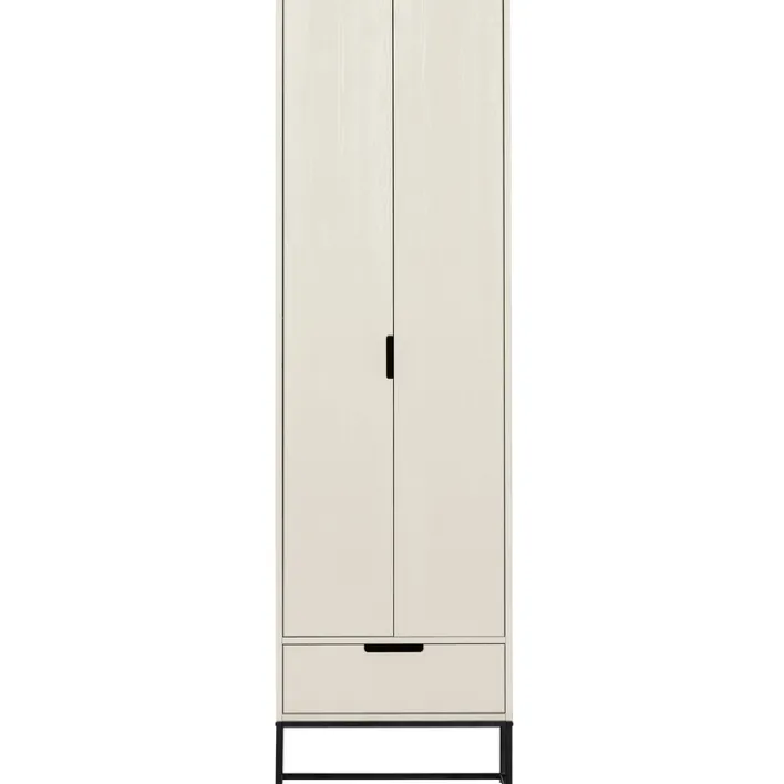 Der Schrank SILAS besteht aus robustem gebürstetem und lackiertem Kiefer Massivholz und einem schwarzen Metallsockel. Mit einer Tiefe von 36 cm lässt er sich auch in kleine Dielen integrieren. Neben dem stilvollen, modernen Look überzeugt der Mehrzweckschrank mit Schubkasten und Schrankteil mit viel Stauraum. Hinter den zwei Drehtüren befinden sich drei Einlegeböden, auf denen sich Alltagsgegenstände übersichtlich aufbewahren lassen.
