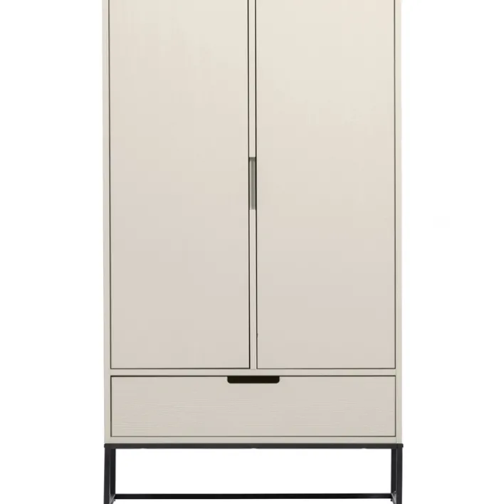 Sein zeitlos elegantes Erscheinungsbild macht den Schrank SILAS zum vielseitig kombinierbaren Möbelstück. So bietet er sich als Garderobenschrank für die Diele ebenso an wie als zusätzlicher Stauraum im Wohn- oder Schlafzimmer. Hinter zwei Drehtüren stehen insgesamt sechs Ablagefächer zur Verfügung. Weitere Dinge lassen sich im unteren Schubkasten verstauen. Der schwarze Metallsockel bildet einen attraktiven Kontrast zu den hellen Fronten und erlaubt die einfache Reinigung unter dem Schrank.