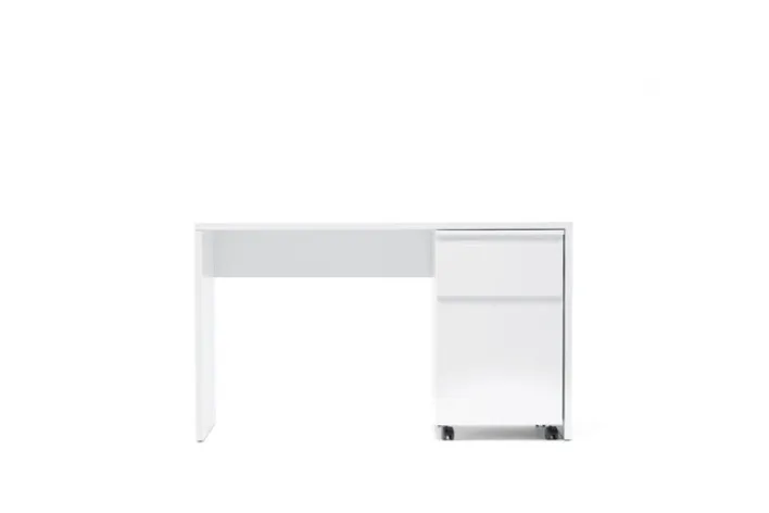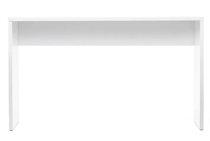 Der 75 cm hohe, weiße Schreibtisch ist 130 cm breit und 54 cm tief. Er beeindruckt mit solider Sachlichkeit und guter Qualität.