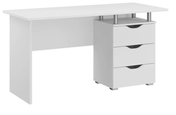 Der 140 x 75 x 66 cm große Schreibtisch ALVARA bietet Kindern und Jugendlichen viel Platz, um ihre Schulaufgaben zu erledigen, zu malen oder zu basteln. Auch ein Computer oder Laptop können problemlos auf der Tischplatte untergebracht werden. In einem offenen Fach und drei Schubfächern lassen sich Hefte, Bücher und Schreibmaterial verstauen. Die Fronten aus robuster Holznachbildung sind in der Farbe Alpinweiß gehalten. Das dezent-moderne Design passt zu weiteren weißen Kinderzimmermöbeln, lässt sich aber auch mit Einrichtungsgegenständen in anderen Farben zusammenstellen.