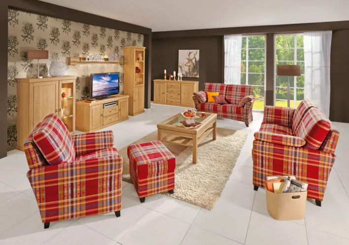 SYDNEY ist ein 2-Sitzer Sofa aus dem Hause SCHRÖNO. Ein solides Holzgestell aus Buche verleiht ihm Robustheit und lange Haltbarkeit. Sichtbar sind davon vier leicht ausgestellte Füße im Farbton Maron, die paarweise in elegant geformte Armlehnen übergehen. Zwischen den gepolsterten Armteilen laden mit Federkern ausgestattete Sitze zum Niederlassen ein, im hinteren Bereich bieten große Rückenkissen nachhaltige Entspannung an. Alle Polster treten mit angenehm weichen Stoffbezug in Erscheinung, er ist kariert ausgeführt und mit kräftigen Farben gestaltet. Der 2-Sitzer ist eine komfortable Bereicherung für jedes Wohnzimmer, seine Optik passt zu klassischen Möbeln ebenso ausgezeichnet wie zu trendigem Interieur. Sie können das Sofa in Ihrem porta! Online Shop einzeln erwerben oder sich für die komplette Serie SYDNEY von SCHRÖNO entscheiden. Dazu gehören ein identisch gestalteter 3-Sitzer und ein Sessel.