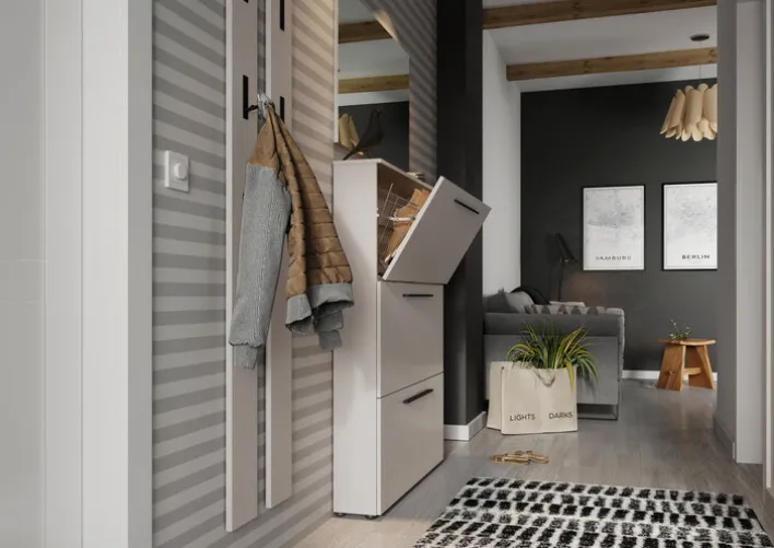 Im Schuhkipper UTAH 100 x 129 cm beige verschwinden Schuhe ordentlich im blickdichten Stauraum auf drei Kippetagen. Hinter den Klappen mit schwarzen Griffleisten sind mehrere Stabablagen verborgen.