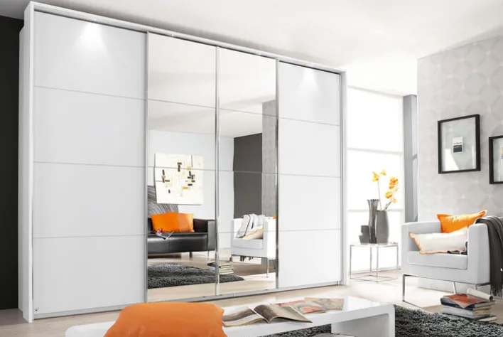 Der Schrank verfügt über vier Schwebetüren, von denen zwei mit Spiegelglas versehen sind. Diese Spiegel verleihen dem Raum nicht nur eine optische Vergrößerung, sondern sind auch praktisch für den täglichen Gebrauch. Die Kombination aus weißen Paneelen und Spiegeln sorgt für ein harmonisches und modernes Erscheinungsbild, das sich nahtlos in verschiedene Einrichtungsstile einfügt.