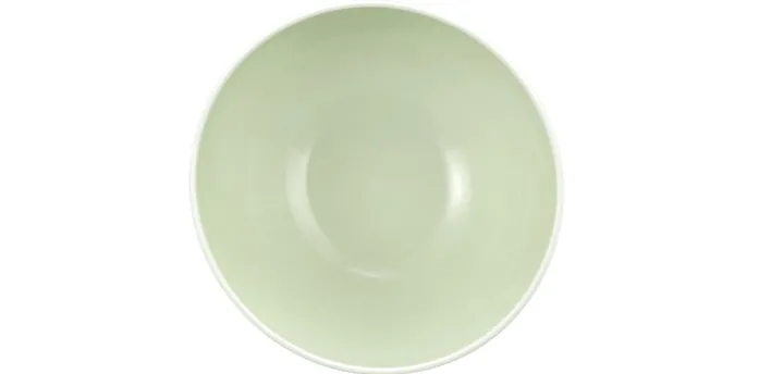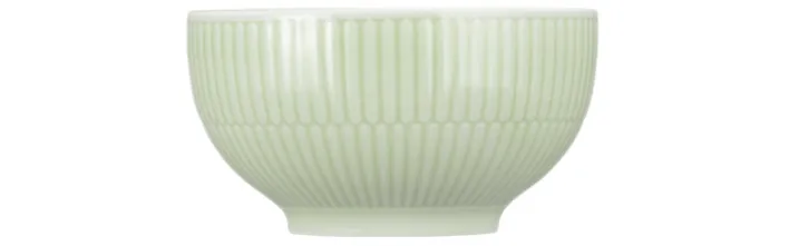 Diese Schale aus der Serie AMINA zeichnet sich durch ihre grüne Farbgebung und ein feines, vertikal geriffeltes Reliefmuster an der Außenseite aus. Das matte, pastellgrüne Porzellan ist glasiert und verleiht dem Objekt eine glatte und pflegeleichte Oberfläche. Die Schale ist rund geformt und besitzt einen leicht ausgestellten Rand sowie einen kleinen Standfuß, der für Stabilität sorgt.