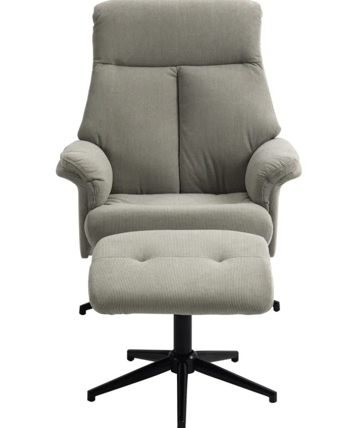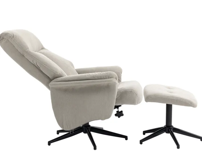 Der Sessel mit Hocker aus der Serie INA bietet eine perfekte Kombination aus Komfort und Stil. Der Sessel ist in einem eleganten Beige-Grau gehalten und besteht aus einem hochwertigen Cord-Textil, das für seine weiche und angenehme Haptik bekannt ist. Die Relaxfunktion des Sessels sorgt für zusätzlichen Komfort und lädt zum Entspannen ein. Der Sessel hat eine Breite von 81 cm, eine Tiefe von 86 cm und eine Höhe von 103 cm, während der Hocker eine Breite von 49 cm, eine Tiefe von 43 cm und eine Höhe von 41 cm aufweist. Das Gestell des Sessels und des Hockers besteht aus pulverbeschichtetem Metall in Schwarz, was für Stabilität und Langlebigkeit sorgt. Der Sternfuß verleiht dem Set eine moderne Optik und bietet gleichzeitig eine stabile Basis. Der Polsteraufbau aus Schaumstoff sorgt für optimalen Sitzkomfort. Dieses Set, bestehend aus einem Sessel und einem Hocker, ist ideal für alle, die Wert auf Design und Funktionalität legen.