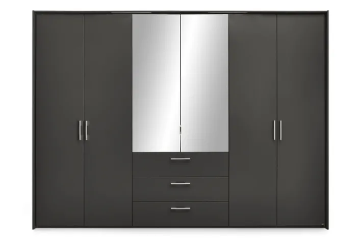 Mit einer Breite von 301 cm, einer Höhe von 223 cm und einer Tiefe von 61 cm bietet der Schrank großzügigen Stauraum für Kleidung und Accessoires. Zur Ausstattung gehören sechs Drehtüren, drei Schubkästen, drei Kleiderstangen und acht Einlegeböden, die eine übersichtliche Organisation ermöglichen. Das Möbelstück besteht aus einer Holznachbildung und ist für den Einsatz im Schlafzimmer konzipiert. Die stabilen Materialien und die hochwertige Verarbeitung sorgen für eine lange Lebensdauer und zuverlässige Funktion im Alltag.