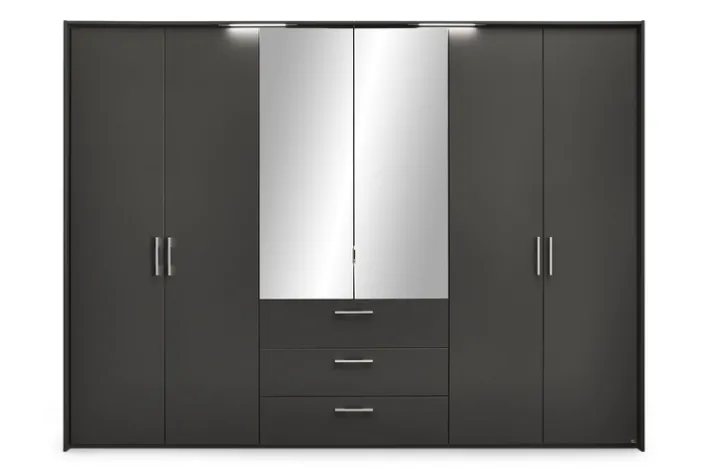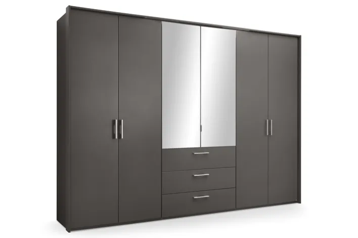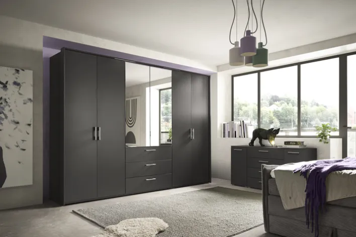 Der Drehtürenschrank HENDERSON aus der Serie set one by Musterring präsentiert sich im modernen Stil und überzeugt durch seine klare Linienführung und die dezente Farbgebung in Graphit metallic. Die Front ist in einem matten Grauton gehalten und wird mittig durch zwei Spiegeltüren ergänzt. Die Spiegelfront sorgt nicht nur für eine praktische Nutzung, sondern verleiht dem Schrank zudem eine zeitgemäße Optik. Die formschönen Griffe aus Metall unterstreichen das moderne Design und ermöglichen ein komfortables Öffnen der Türen und Schubkästen.
