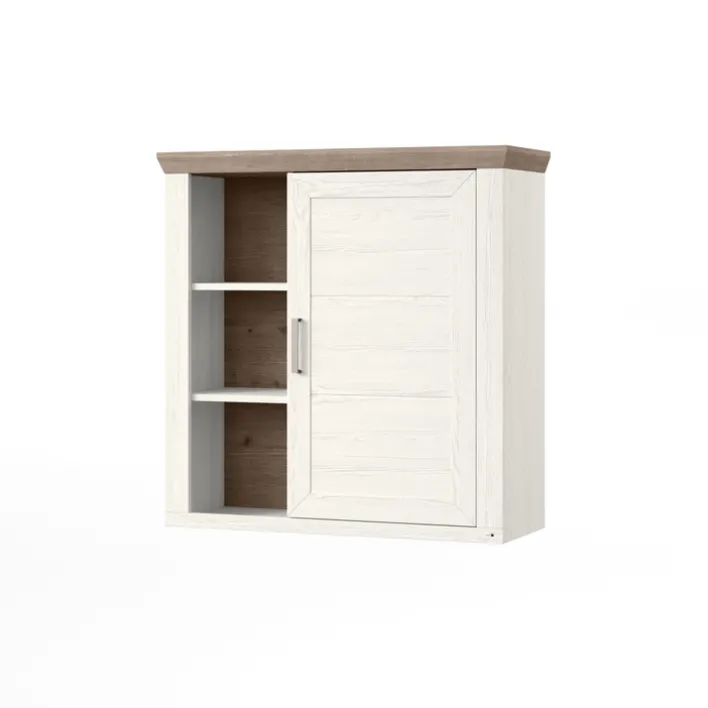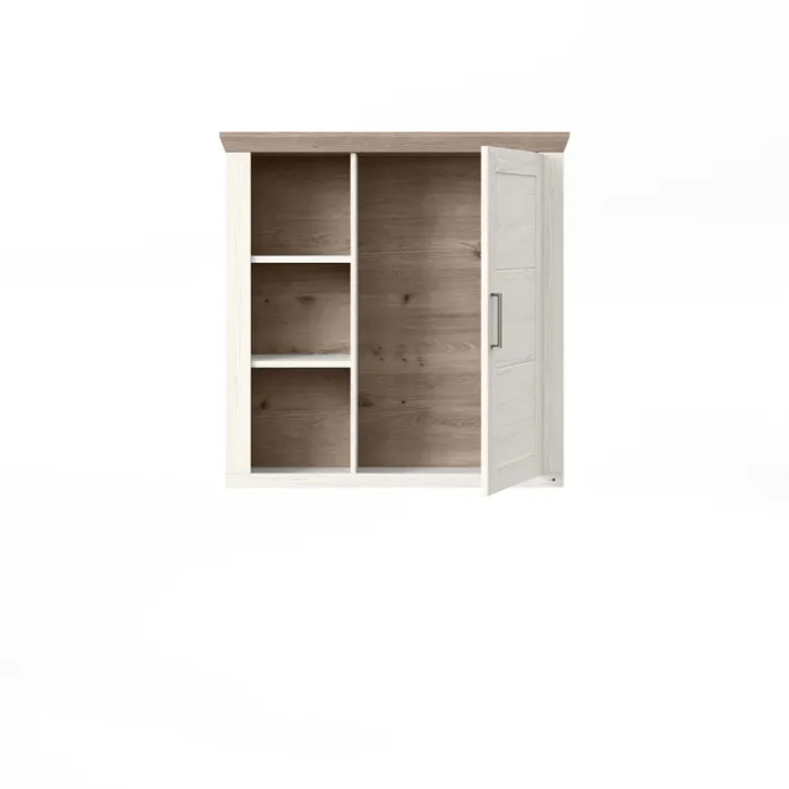 Die Hängevitrine eignet sich aber auch für das Esszimmer oder als Medizinschrank. Neben der Tür bietet die Hängevitrine drei offene Fächer in gleicher Höhe, in denen Sie Ausstellungsstücke oder Gebrauchsgegenstände für den schnellen Zugriff platzieren können.
