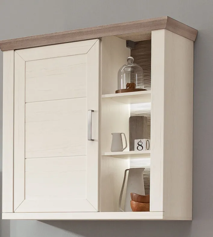 Die Oberflächen der Vitrine sind in Pino Aurelio Nachbildung gestaltet. Die von vorn sichtbaren Rückwände des Hängeschrankes präsentieren sich im Eiche Nelson Dekor.