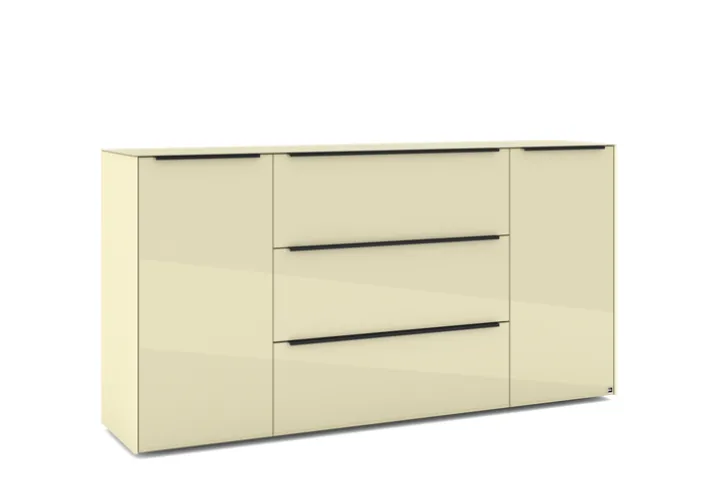 Gefertigt aus einer Kombination von Glas und Holznachbildung, vereint die Kommode Funktionalität mit stilvollem Design. Die klaren Linien und die schlichte Formgebung machen sie zu einem vielseitigen Möbelstück, das sich harmonisch in verschiedene Wohnstile einfügt. Die schwarzen Griffe setzen einen dezenten Kontrast zur Hauptfarbe Beige und unterstreichen das moderne Erscheinungsbild. Diese Kommode ist die ideale Wahl für alle, die Wert auf Qualität und zeitgemäßes Design legen.