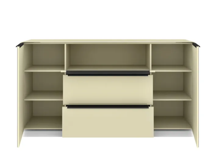 Die Kommode aus der Serie RENO besticht durch ihr modernes Design und die elegante Farbgebung in Kaschmir matt. Mit einer Breite von 182 cm, einer Höhe von 94 cm und einer Tiefe von 42 cm bietet sie großzügigen Stauraum. Die Oberfläche ist lackiert und präsentiert sich in einem ansprechenden Hochglanz-Finish, das dem Möbelstück eine edle Optik verleiht. Die Kommode verfügt über zwei Drehtüren, zwei Schubkästen und eine Klappe, die durch gedämpfte Scharniere sanft schließen. Vier Einlegeböden bieten zusätzlichen Platz für Ihre Utensilien.