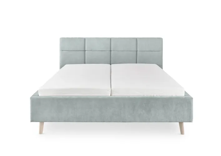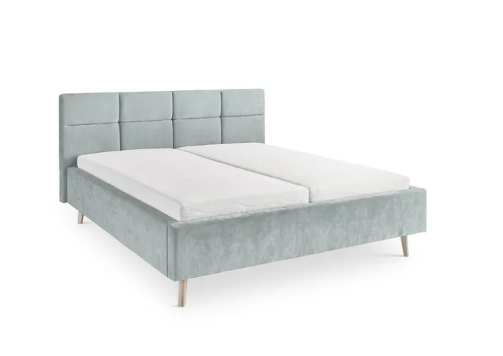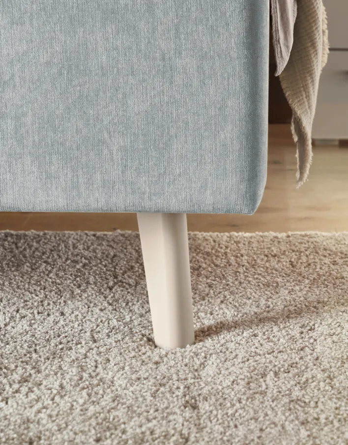 Das Polsterbett aus der Serie CARY bietet eine Liegefläche von 180 x 200 cm und ist für den Einsatz im Schlafzimmer konzipiert. Das Bettgestell besteht aus Holz und ist vollständig mit einem hellblauen, glatten Synthetikfaserstoff aus 100 % Polyester gepolstert. Die sichtbare Oberfläche wirkt samtig und weich, was durch das gleichmäßige Materialbild und die dezente Struktur zusätzlich unterstrichen wird. Das Kopfteil ist 110 cm hoch und mit einer klaren, rechteckigen Steppung versehen, die dem modernen Stil entspricht und für eine ruhige, unaufdringliche Optik sorgt. Die Füße sind aus Holz gefertigt und in einer natürlichen, hellen Farbgebung gehalten, was einen harmonischen Kontrast zum Bezug herstellt.