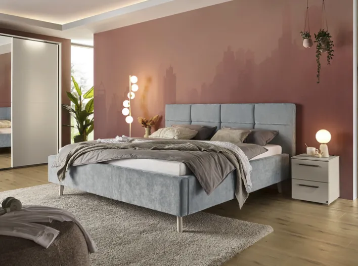 Das Gesamtmaß beträgt 219 cm in der Länge, 204 cm in der Breite und das Bett besitzt eine maximale Belastbarkeit von 240 kg. Im Lieferumfang sind weder Lattenroste noch Matratzen enthalten. Die Konstruktion ist für den Innenbereich vorgesehen und eignet sich speziell für Schlafräume. Das Bett stammt aus der Produktlinie set one by Musterring. Die Kombination aus gepolstertem Rahmen, ruhiger Farbgebung und klarer Linienführung macht das Modell zu einer modernen, zurückhaltenden Schlaflösung.