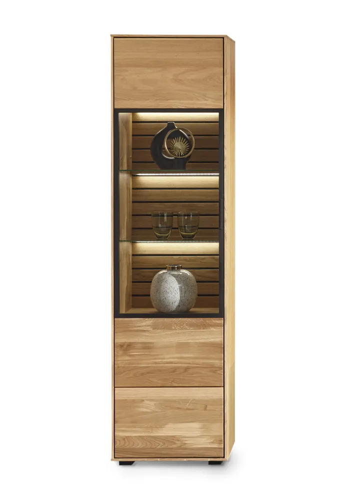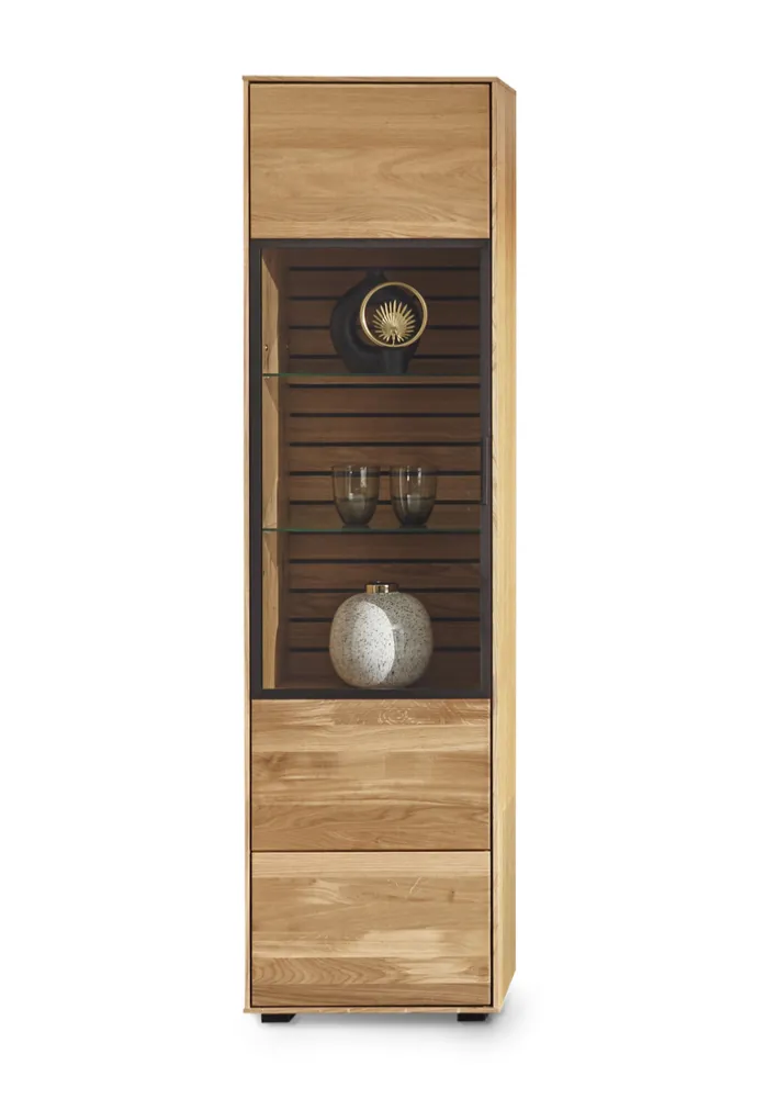 Hergestellt aus massiver und furnierter Eiche erweist sich die braun-grau-schwarze Vitrine JACKSON in der Größe 50 x 198 cm als höchst robust. Die edle Glasscheibe erlaubt den Blick ins Innere.