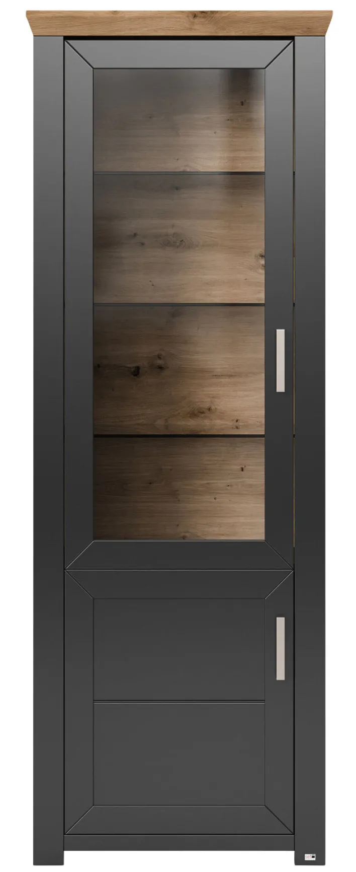 Die set one by Musterring Vitrine YORK 01 kombiniert den grauen Korpus mit Absetzungen in Artisan Eiche und einem großen Glaseinsatz. Hinter der Vitrinentür ist die eichefarbige Rückwand sichtbar, wodurch die Vitrine top modern und doch natürlich wirkt. Auf drei gläsernen Einlageböden bietet der Vitrinenteil zudem viel Platz um Souvenirs und Lieblingsporzellan optimal zur Geltung zu bringen. Der Schrankteil im unteren Bereich ist mit einem Holzeinlegeboden ausgestattet und ist zur Aufbewahrung von Alltagsgegenständen geeignet.