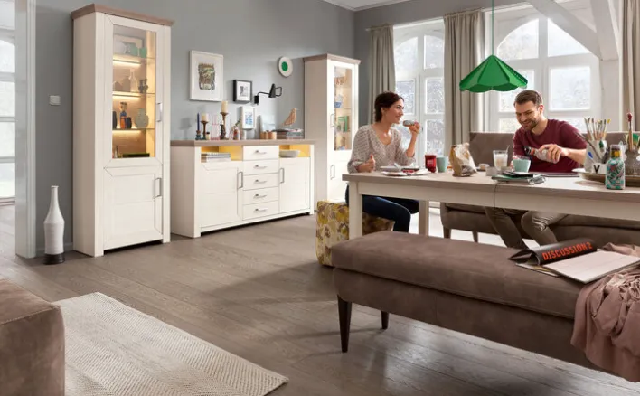 Die Vitrine YORK in Pino Aurelio Nachbildung mit Absetzung in Eiche Nelson ist ein Blickfang für jede Wohnung und harmoniert wunderbar mit weiterem Mobiliar der Serie.