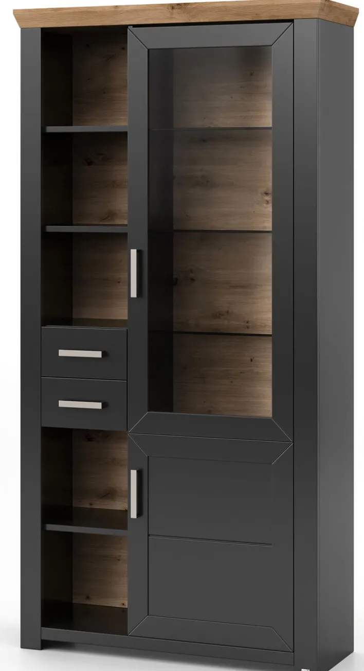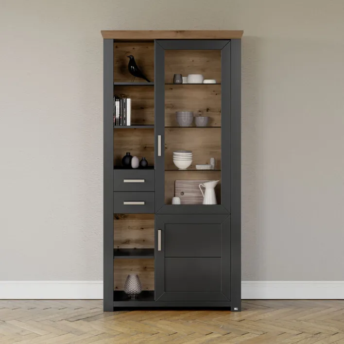 Das moderne Möbel zeigt ein ungewöhnliches Design: Die linke Seite ist bis auf zwei Schubladen offen. Rechts befindet sich klares Glas in Form einer Vitrinentür. Rechts unten ist eine feste Tür erkennbar. Durch das Aufeinandertreffen der beiden Türen ergibt sich ein formschönes Bild, das dem Möbel seinen speziellen Charme verleiht. Zu dem dunklen Grau der Front passt die Holznachbildung in Eiche Artisan ausgezeichnet. Die Vitrine gibt es in unterschiedlichen Ausführungen.
