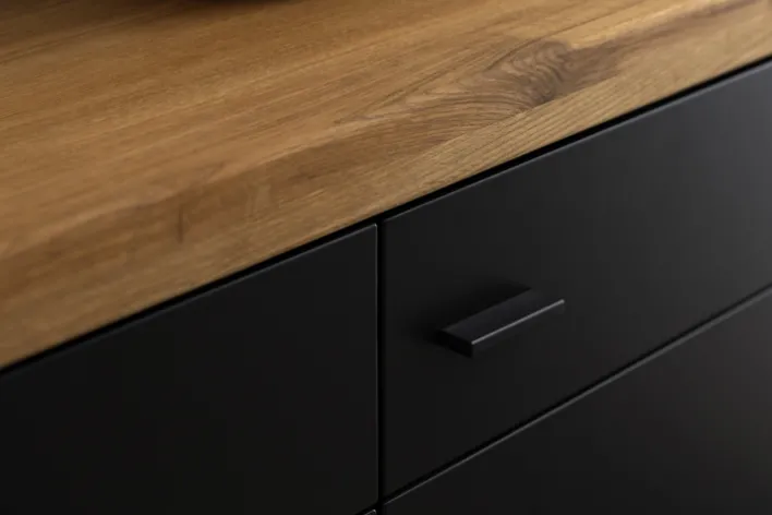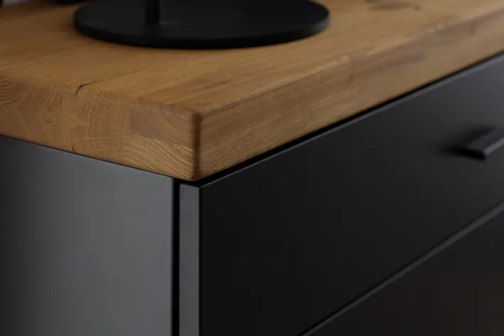 Das Sideboard aus der Serie BOGOTA vereint modernes Design mit praktischer Funktionalität. Mit einer Breite von 150 cm, einer Höhe von 96 cm und einer Tiefe von 37 cm bietet es großzügigen Stauraum. Die Kombination aus massiver Wildeiche und anthrazitfarbenen Elementen verleiht dem Möbelstück eine elegante und zeitgemäße Optik. Die lackierte Oberfläche sorgt für eine pflegeleichte und langlebige Nutzung.