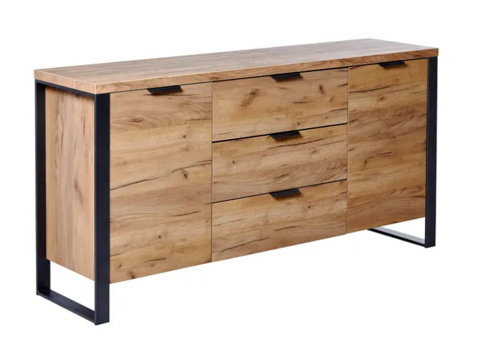 Das Sideboard LOOP ist aus hochwertiger Holznachbildung gefertigt und zieht mit seiner täuschend echten Holzoptik alle Blicke auf sich. Abgerundet wird das stilvolle Vintage Design von anthrazitfarbenen Metallfüßen und schlichten Griffen. Die Kommode ist mit einer extra dicken Oberplatte ausgestattet, die mit bis zu 40 kg belastet werden kann. Außerdem ist das Sideboard dank kratzfester Oberflächen sehr langlebig. Wie von einer Kommode gewünscht, bietet das Sideboard in drei Schubkästen und hinter zwei Drehtüren natürlich auch viel Stauraum.
