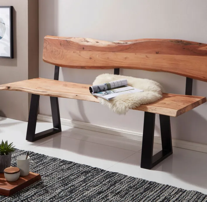 Auf der Bank haben insgesamt bis zu vier Personen bequem Platz. Sowohl die Sitzfläche als auch die Rückenlehne, die mit zwei schwarzen Stangen verbunden sind, bestehen aus massivem Holz. Das Kufengestell ist aus robustem Eisen, das in einem matten schwarzen Farbton pulverbeschichtet ist. Die Bank kann bis zu insgesamt 200 Kilogramm belastet werden.