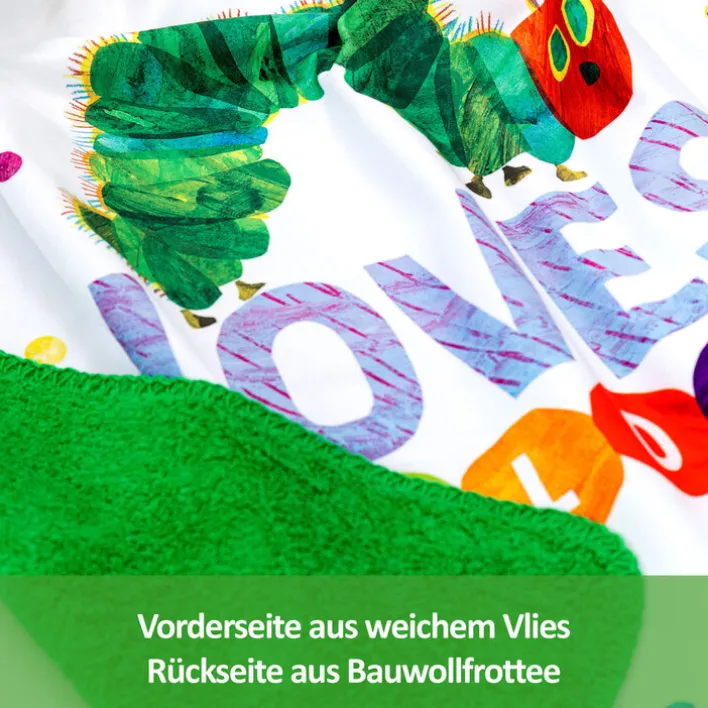 Die mehrfarbige Smithy by Dagmar Nelk Kinderdecke RAUPE NIMMERSATT ist 75 cm breit und 90 cm lang. Sie bezaubert mit einem großen Motivdruck der niedlichen Raupe Nimmersatt und unzähligen bunten Punkten auf weißem Untergrund. Die andere Seite der Decke ist einfarbig grün gehalten.