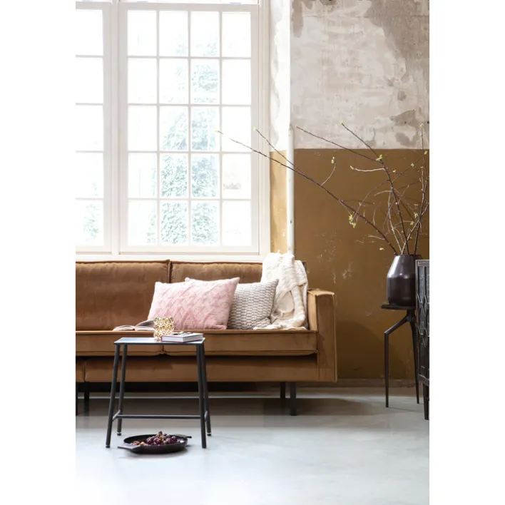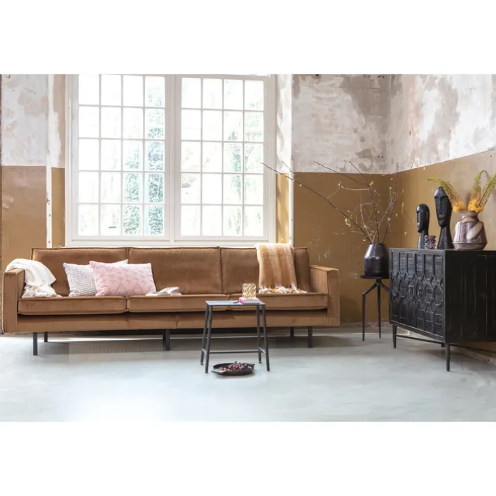 Der honiggelbe RODEO 3-Sitzer könnte im Wohnzimmer, ebenso aber beispielsweise in einem modern eingerichteten Büro stehen. Die geraden Armlehnen sorgen für eine sehr klare Formgebung, ebenso die sichtbare Unterteilung als 3-Sitzer. Der fast schon goldene Farbton des Samt-Bezugs würde seine Stärken ebenso in einem Kaminzimmer voll und ganz ausspielen.
