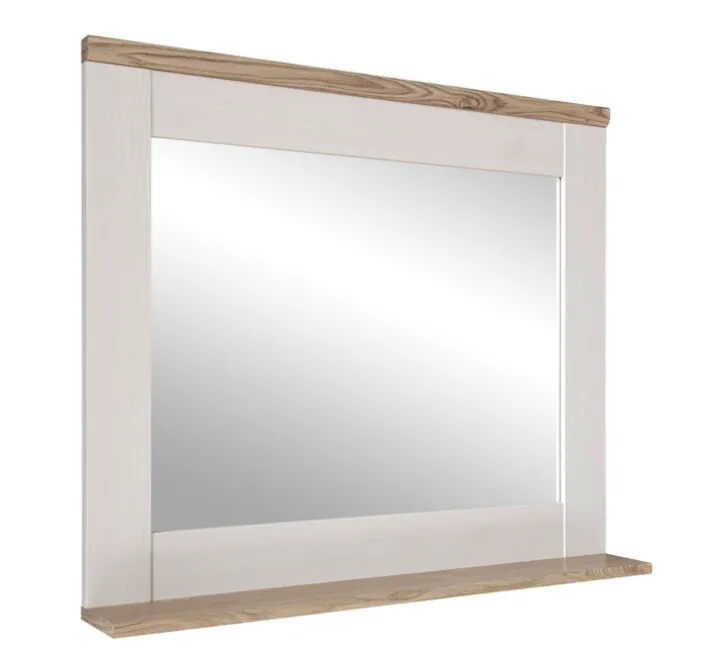Der Spiegel hat eine rechteckige Form und besitzt einen breiten Rand aus einer hochwertigen Holznachbildung. Die Oberfläche begeistert mit dem Farbton Sibiu Lärche und einer Absetzung im San Remo hell Dekor. Die Spiegelfläche wurde natürlich aus hochwertigem Spiegelglas gefertigt und hat die optimale Größe zum Zähneputzen, Schminken oder Rasieren. Somit eignet sich der Spiegel ganz hervorragend für das Badezimmer. Außerdem ist er mit einer praktischen Ablage ausgestattet, auf der Sie beispielsweise Ihren Zahnputzbecher oder Ihre Haarbürste platzieren können.