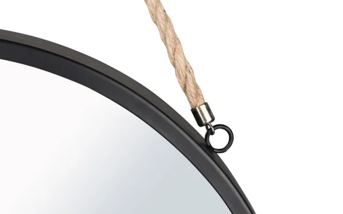 Der runde Dekospiegel NINA hat einen Durchmesser von 40 Zentimetern und ist mit einem schmalen Metallrahmen in Schwarz ausgestattet. Der Spiegel wird über ein Seil aufgehängt.