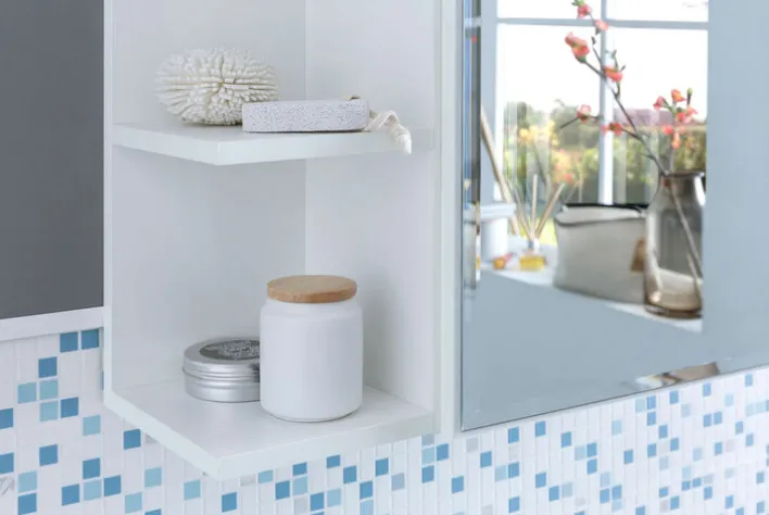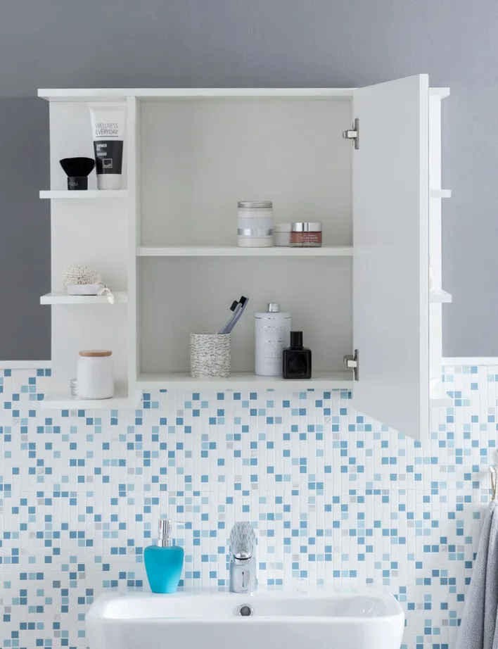 Über dem Waschbecken im Badezimmer oder Gäste-WC angebracht ist der Spiegelschrank eine unentbehrliche Unterstützung beim Schminken, Rasieren und Frisieren. Die zahlreichen Ablageflächen eignen sich zur Lagerung von Bad-Utensilien. In den beiden Fächern hinter der Spiegeltür lassen sich Make-up & Co. spritzwassergeschützt unterbringen. Die offenen Fächer bieten einen schnellen Zugang zu Accessoires, die häufig benötigt werden. Sie können auch als Dekofläche für eine gemütliche Badgestaltung genutzt werden.