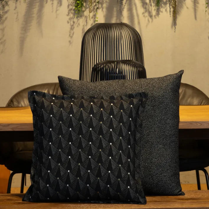 Die Kissenhülle aus der Serie HOMEY TREE von Sprügel besticht durch ihr elegantes Design in Schwarz-Gold. Die Hauptfarbe Schwarz wird durch goldfarbene Akzente ergänzt, die ein stilvolles und modernes Muster bilden. Das geometrische Design mit kleinen, gleichmäßig verteilten Punkten verleiht der Kissenhülle eine besondere Textur und Tiefe.