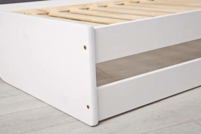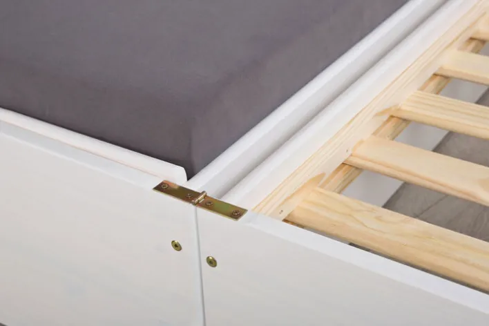 JANNES wird aus massivem, weiß lackiertem Kiefernholz hergestellt. Im Lieferumfang sind zwei Lattenroste enthalten. Diese sind bis maximal 100 kg belastbar. Bei Bedarf kann das Bett ausgeklappt werden, wodurch eine praktische und komfortable Gästeliege entsteht. Eine weitere Gästeliege kann aus dem Schubkasten unterhalb der oberen Gästeliege herausgezogen werden. Alternativ bietet dieser Schubkasten viel Stauraum, der etwa für Bettwäsche genutzt werden kann.
