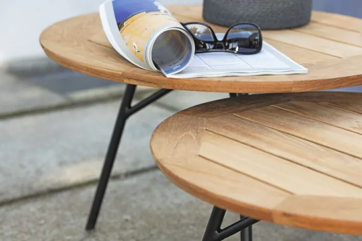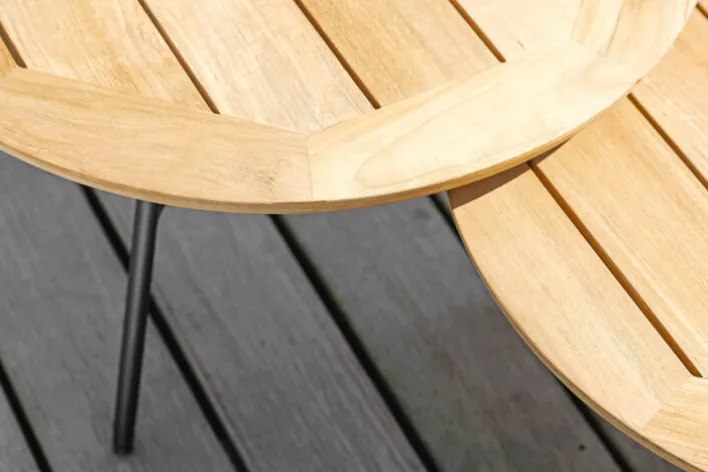Der STERN Lounge Gartentisch FRIDA kombiniert das schwarz pulverbeschichtete Aluminiumgestell mit einer runden Tischplatte aus massivem Teakholz. Durch die Kombination von Holz und schwarzem Metall wirkt der Gartentisch top modern, strahlt aber dennoch Wärme und Gemütlichkeit aus. Der dreibeinige Gartentisch lässt sich hervorragend mit Loungemöbeln kombinieren und kann mit einem Gewicht von 3,6 kg ohne große Mühe umgestellt werden. Verwenden lässt sich der trendige Gartentisch FRIDA auf Balkon und Terrasse ebenso wie in Innenräumen.