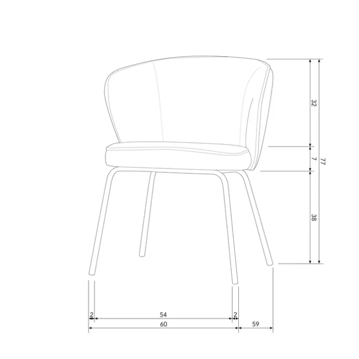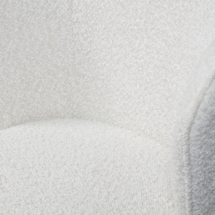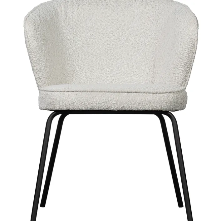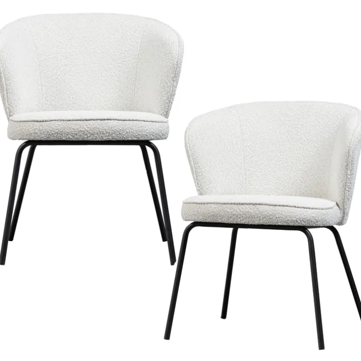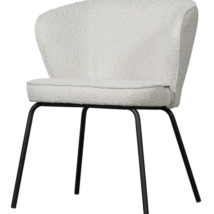Die aus Bouclé gefertigte Polsterung bietet einen hohen Sitzkomfort. Durch die leicht geschwungene Lehne ermüdet die Rückenmuskulatur auch dann nicht so schnell, wenn Gespräche am Esstisch einmal etwas längern dauern. Der Stuhl eignet sich für das Esszimmer und das Wohnzimmer. Sein Vierfußgestell ist aus Metall gefertigt und hat eine matte Oberfläche. Fingerabdrücke sind aufgrund der Oberflächenbeschaffenheit nicht unmittelbar sichtbar. Ein Esstisch kann separat bestellt werden.