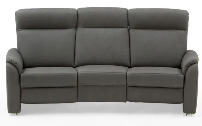 Die Kappnaht des mit einem Textilgewebe aus reinem Polyester gearbeiteten Sofas bietet in einem hellen Beige einen feinen farblichen Kontrast zum dunklen Anthrazit. Der komplette Rücken des Modells mit den drei breiten Sitzflächen ist ebenfalls mit dem leicht zu pflegenden Stoff bezogen. Für den hohen Komfort sorgt im Inneren der Sitze ein Federkern. Die nickelfarbigen Füße sind aus Metall gefertigt.
