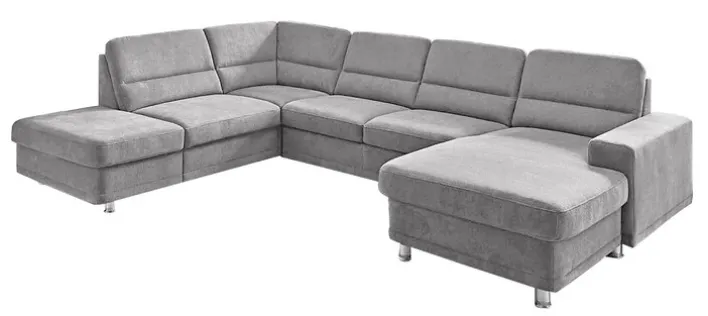 Die tiefe Sitzfläche und die hochwertige Polsterung verleihen der SYSTEMPOLSTER Wohnlandschaft einen besonders hohen Sitzkomfort. Die Wohnlandschaft setzt sich aus einem 1,5-Sitzer auf der linken Seite und einem 2,5-Sitzer Armteil auf der rechten Seite zusammen. Sie ist mit einem Bezug aus grauer Synthetikfaser versehen. Der fühlt sich angenehm weich an und ist zugleich sehr strapazierfähig. Abgerundet wird das Design durch das filigrane Metallgestell, das mit einer matten chromfarbigen Oberfläche überzeugt.