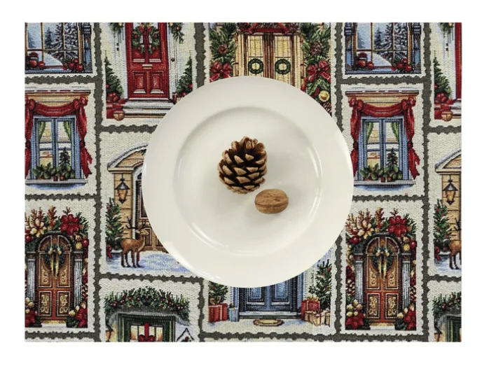 Das Design des Tischläufers ist geprägt von weihnachtlichen Szenen, die in einem harmonischen Farbschema gehalten sind. Die abgebildeten Türen und Fenster sind mit Kränzen und anderen festlichen Dekorationen geschmückt, was dem Tischläufer eine warme und einladende Ausstrahlung verleiht. Dieses Produkt ist ideal für alle, die ihre Tischdekoration zur Weihnachtszeit mit einem besonderen Akzent versehen möchten.
