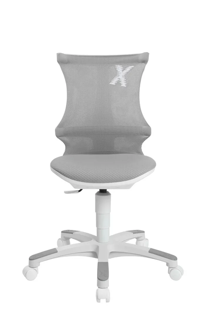 Der drehbare Stuhl mit der außergewöhnlichen Rückenlehne passt sich jeder Bewegung an. Der atmungsaktive Netzbezug der Lehne besteht aus grauen Synthetikfasern (Polyester), der gepolsterte Sitz mit dem feinen Design sorgt für hohen Komfort. So kann der Nachwuchs in Ruhe arbeiten und fühlt sich auch bei längerem Sitzen wohl. Das weiße Stuhlgestell besitzt fünf stabile Arme mit leicht beweglichen Doppelrollen. Er ist zudem auf Sicherheit geprüft und für Kinder zwischen fünf und 13 Jahren geeignet.