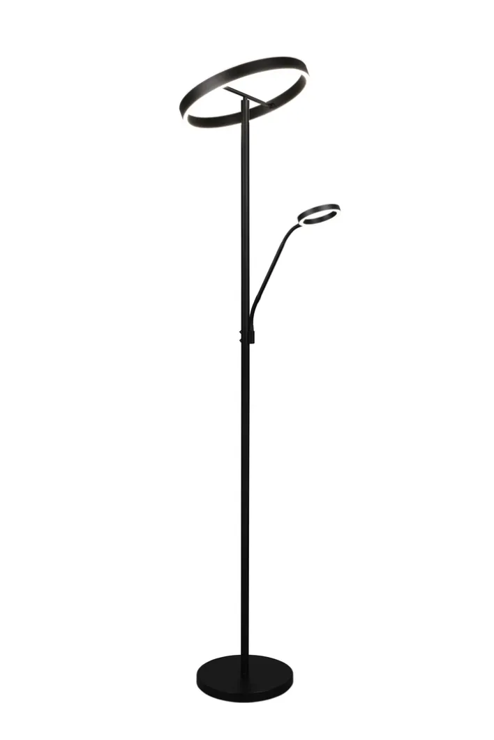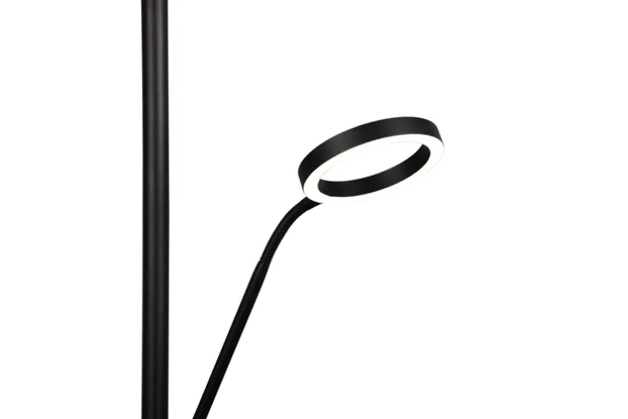 Der Deckenfluter mit Leselampe aus der Serie WILLIS von TRIO vereint modernes Design mit funktionaler Beleuchtung. Die Lampe ist aus hochwertigem Metall gefertigt und präsentiert sich in einem eleganten Schwarz mit matter Optik. Mit einer Höhe von 180 cm und einem Durchmesser von 40 cm fügt sie sich harmonisch in verschiedene Wohnräume ein. Der runde Tellerfuß sorgt für Stabilität und unterstreicht das zeitgemäße Design. Die integrierte LED-Beleuchtung bietet eine Lichtleistung von 4.600 Lumen bei einer Farbtemperatur von 2700/3200/4.000 Kelvin. Zusätzlich ist die Lampe mit einem Sensordimmer ausgestattet, der eine dreistufige Dimmung und eine Lichtfarbverstellung (CCT) ermöglicht. Die Leselampe ist separat schaltbar und bietet eine zusätzliche Lichtquelle mit 550 Lumen. Diese Lampe ist ideal für alle, die eine stilvolle und anpassungsfähige Beleuchtungslösung suchen.