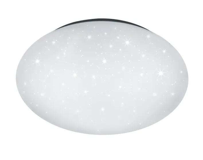 Die TRIO LED Deckenlampe PAOLO mit Funktion wird inklusive Leuchtmittel geliefert. Sie zeigt einen Sternenhimmel. Ihr Durchmesser beträgt 37 cm. Sie besteht hauptsächlich aus weißem Kunststoff. Ihre Höhe liegt bei 8,5 cm.
