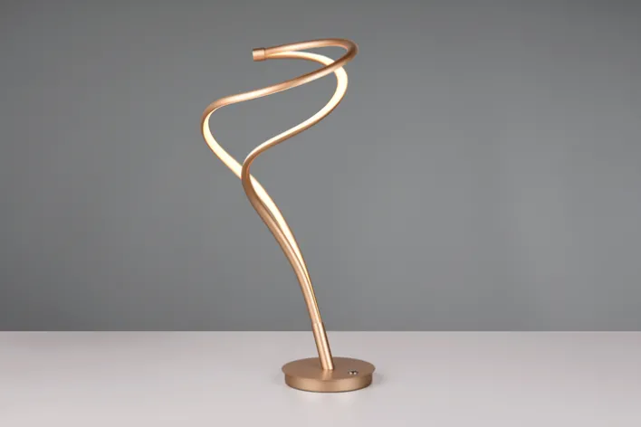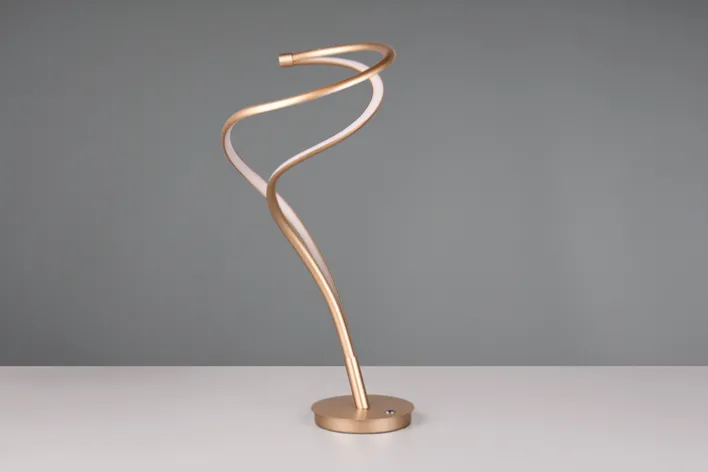 Die TRIO LED Tischlampe TRS NALA ist 56 cm hoch mit einem Durchmesser von30 cm. Sie ist aus goldfarbigem Metall und, wiegt 1 kg Lichtfarbe und Helligkeit sind stufenlos einstellbar, das fest verbaute Leuchtmittel leistet 17 Watt.