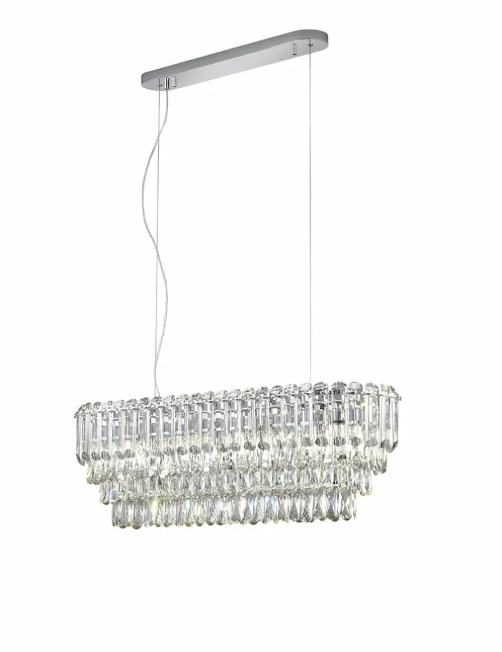 Die Pendelleuchte MALIZIA von Trio vereint modernes Design mit eleganter Funktionalität. Mit einer Breite von 150 cm und einer Höhe von 29 cm ist sie ein beeindruckendes Element für jeden Raum. Die Leuchte besteht aus hochwertigem Metall und Kristallglas, was ihr eine luxuriöse Ausstrahlung verleiht. Die chromfarbene Oberfläche harmoniert perfekt mit den klaren Kristallglas-Elementen, die das Licht auf faszinierende Weise brechen und reflektieren.