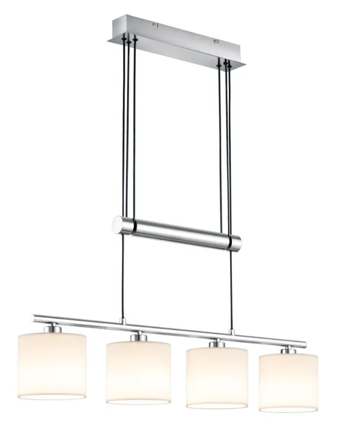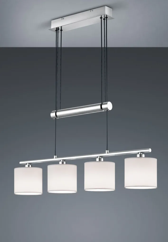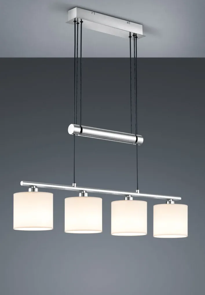 Die Pendelleuchte aus der Serie GARDA überzeugt mit einem modernen, geradlinigen Design. Sie verfügt über vier zylindrische Leuchtenschirme in Weiß, die für eine gleichmäßige Lichtverteilung sorgen. Das Gestell besteht aus Metall in einer silberfarbenen Ausführung, was einen zeitlosen und schlichten Gesamteindruck vermittelt. Die Leuchte ist höhenverstellbar und eignet sich besonders für den Einsatz im Innenbereich, beispielsweise über Ess- oder Arbeitstischen.