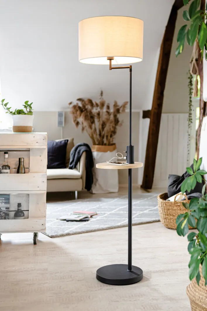 Die Retrofit Stehlampe CLAAS von der Marke Trio Leuchten ist 160 Zentimeter hoch und mit einem Tisch und einem USB-Anschluss ausgestattet. Mit ihrem grauen Leuchtenschirm spendet sie jederzeit ein angenehmes Licht. Ein modernes Design, eine hochwertige Verarbeitung und zahlreiche praktische Funktionen machen die Stehlampe CLAAS zu einer idealen Lichtquelle in jedem Wohnbereich. Der angewinkelte Leuchtenarm ist in eine gewünschte Richtung schwenkbar und lässt sich variabel verstellen. Der Lampenfuß besteht aus Metall in der Farbe Schwarz matt. Die Stehlampe verfügt ferner über ein rundes Tischchen, welches als Ablagefläche für eine Lesebrille oder ein Mobiltelefon dient. Direkt über der Ablage befindet sich am Metallbein der Stehlampe ein USB-Anschluss, mit dem Sie Ihr Handy, eine Smart Watch oder ein Tablett bequem aufladen können. Mit einem Schalter über der USB-Schnittstelle wird die Stehlampe einfach ein- und ausgeschaltet. Als Lichtquelle lassen sich 60 Watt Retrofit oder 12 Watt LED Leuchtmittel mit der Fassung E27 verwenden. #porta #portamöbel #naturtyp #meinporta #coffeeculture