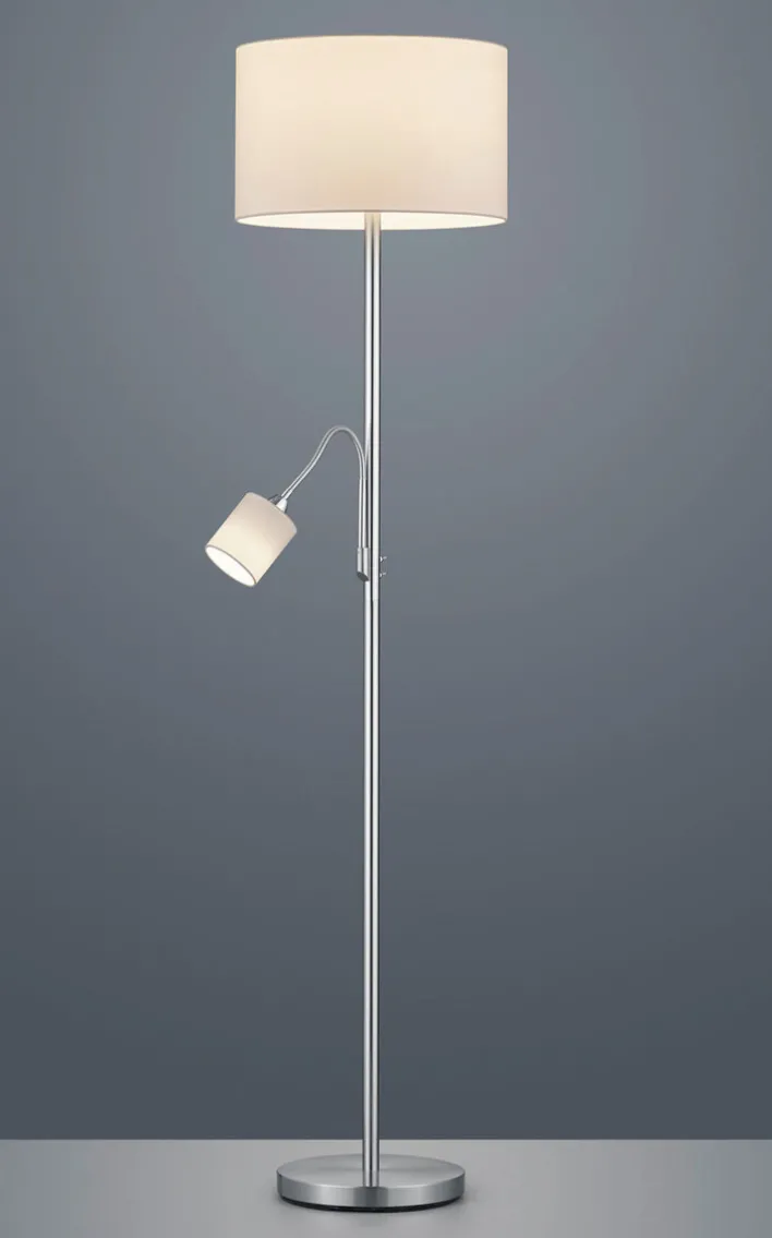 Die TRIO Retrofit Stehlampe HOTEL mit weißem Schirm integriert eine zweite, kleine Leselampe. Die 170 Zentimeter hohe Hotel-Leuchte steht auf einem runden, nickelfarbigen Ständer aus matten Metall. Leuchtmittel der AGL und Retrofit mit einer E14- und E27-Fassung sind für den angenehm gedämpften aber hellen Lichtschein der Retrofit Stehlampe HOTEL erforderlich.